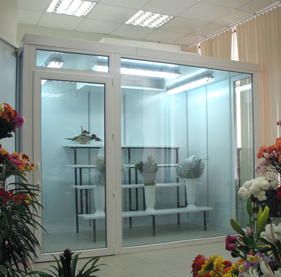 Каждая холодильная камера для цветов изготавливается из стеклянных плотно-прилегающих пакетов, при помощи которых создаются привлекающие внимание павильоны для продажи цветов. Букеты, которые размещаются внутри холодильной камеры, можно хорошо разглядеть благодаря таким стенам.